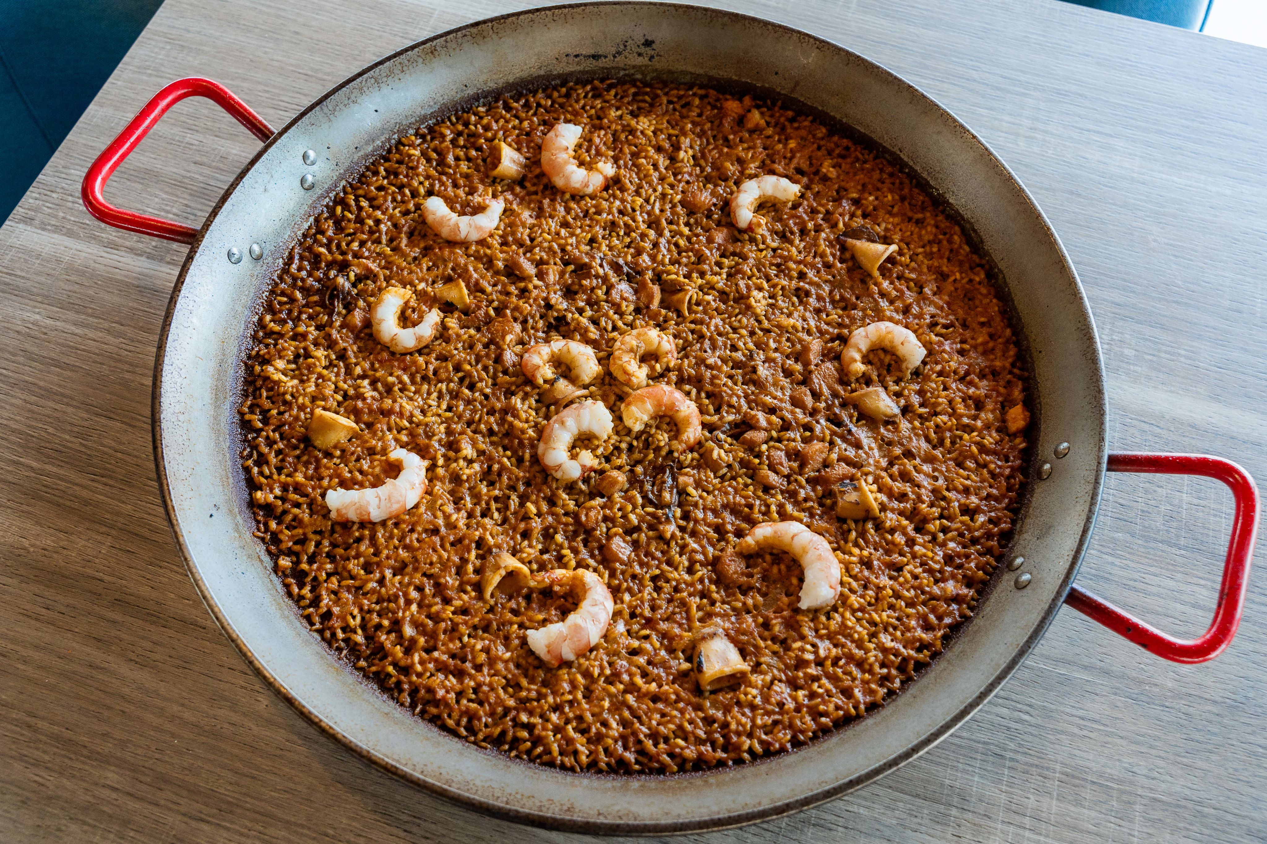 El arroz del señoret es su plato estrella. Parte de un sofrito sencillo —ajo, pimentón y salsa de tomate casera— que se enriquece con calamar, cazón y un fumet elaborado durante días con cabezas de rape, puerro y cebolla. El arroz se añade cuando el caldo ya está hirviendo, sin nacarar. Se cocina exactamente 18 minutos y, desde el minuto 8, el equipo va moviendo grano a grano con pinzas para que nada quede crudo. “Si has pagado 100 gramos de arroz, te los tienes que comer todos, no 98. Aquí no hay grano que se quede sin cariño”.