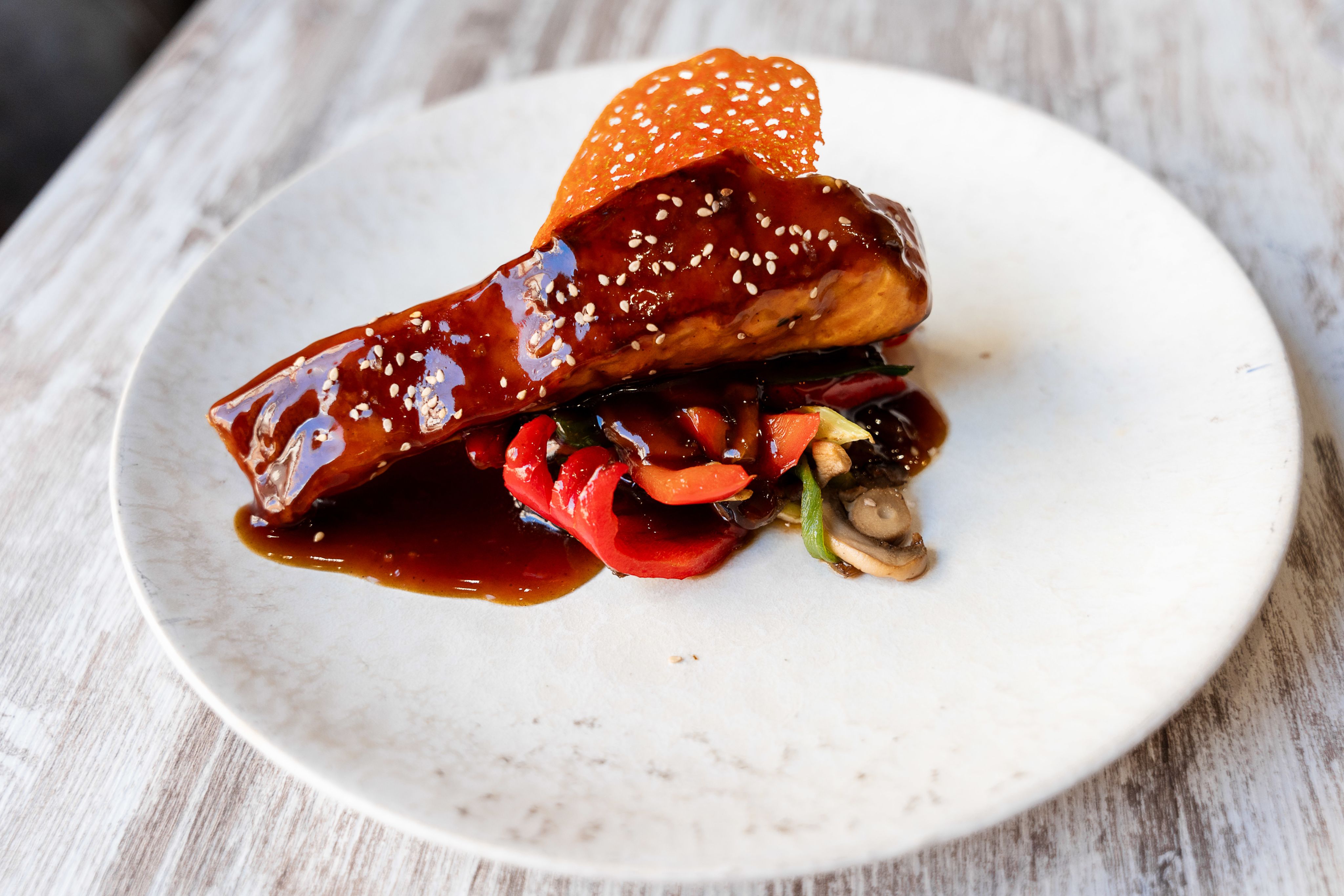 Otro plato muy celebrado es el salmón fresco con teriyaki. Se marca en plancha y se sirve sobre un wok de verduras con un toque de soja. Sencillo, directo y sabroso. “Aquí no buscamos complicar. La clave está en tratar bien el género y cocinar como lo harías para ti. Si a ellos les gusta, me alimenta a mí también”. Esa es la filosofía de Alejandro, que sigue cocinando con la misma emoción con la que amasaba pizza con su madre.